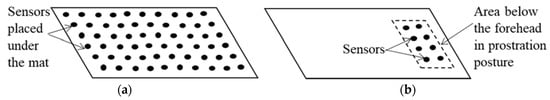 Despite differences in implementation, all of these smart prayer mats have several features in common. Namely, they differentiate human postures by patterns of binary signals (0 and 1) generated from switches or pressure sensors embedded into the mat. The sensors operate locally while the postures span the entire area of the prayer mat. Therefore, the devices either employ a large number of sensors distributed over the mat, as shown in Figure 2a, in order to improve the detection accuracy on expense of cost (e.g., [,]), or use a few sensors placed under the forehead (see Figure 2b) to detect the prostration posture only (e.g., [,,]). These cost-oriented solutions do not take into account the other postures of the Rakah sequence and thus might increment the counter when the user skips a posture or makes two prostrations consequently; which is unacceptable. Besides, to our knowledge, none of the existing prayer mats proposed so far can differentiate the standing posture from the bowing posture, thus impeding the correct posture recognition.