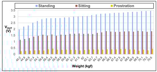 For the sake of simplicity, we depict only the maximal values of the normalized voltages generated by sensors in Areas 1 and 2 for the bowing, the sitting and the prostration postures. The absolute variation of peak voltage (V0) with the weight is given in Figure 4. Interestingly, the voltage ranges associated with the postures are quite distinguishable and do not depend much on the user’s weight. In the sequel, we exploit these voltage–posture correlation for posture detection.
