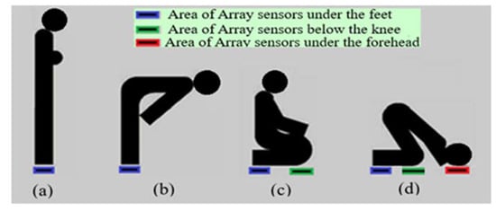 Sensing areas associated with praying postures: (a) standing, (b) bowing, (c) sitting, (d) prostration.