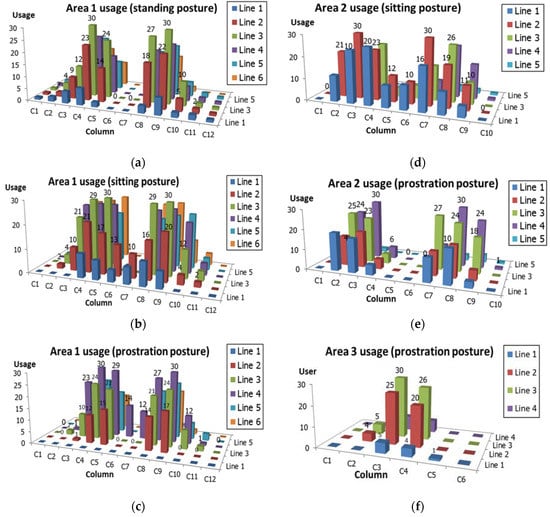 The mat area usage in different postures. (a) Area 1 usage at standing posture; (b) Area 1 usage at sitting posture; (c) Area 1 usage at prostration posture; (d) Area 2 usage at sitting posture; (e) Area 2 usage at prostration posture; (f) Area 3 usage at prostration posture.