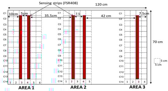 Figure 6 shows the details of mat area usage for each posture. In this figure, lines and columns determine the squares within the mat areas (see Figure 7); the vertical axis shows the square usage in terms of the number of participants that touched a particular square in a posture. The two visible peaks in the graphs, associated with Areas 1 and 2, correspond to the mat regions used by the left and the right legs, respectively; the graph at the bottom reflects the regions of Area 3 touched by head. As the results demonstrate, every participant in the test placed their feet over Line 3 of Area 1 in the standing posture, pressed Line 3 of Area 1 and Line 2 of Area 2 in the sitting posture, and in the prostration posture had their feet over Line 4 of Area 1, their knees over Line 4 of Area 2 and their forehead over Line 3 of Area 3. Thus, to detect all of the postures of the Rakah sequence, only five strip-type (Model 408) FSR sensors [] are needed. A standard strip-type FSR-408 sensor is 622 mm long and 6.35 mm wide, and 1 mm thin. Because it responds to pressure applied from up to ±5 cm from its edge, we position the sensors on the mat as shown in Figure 7.