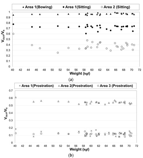 Normalized voltage variations observed on outputs of sensors in Area 1–3 when 30 users of different weight performed the bowing and sitting postures (a), and the prostration posture (b).