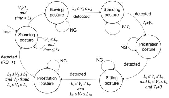 Figure 9 illustrates the proposed posture generation and Rakat counting technique in terms of state transition diagram. In this figure, circles represent postures; arrows show their execution order in Rakah sequence, the formulas above the arrows represent conditions at which the posture is considered detected i.e., the state transition occurs. The thresholds associated with the conditions have been obtained from an analysis of experimental data, of which a part is shown in Figure 8.