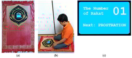 Khatri [] proposed the use of a solar-powered electrical switch pad and liquid crystal display (LCD) operable by a forehead of a worshipper when he or she prostrates on the mat. Faouaz [] also used LCD with a switch, built in the prayer mat, with the difference that the switch is turned on and off by the user. Abdelmohsen [] advocated placing a so-called “pressurable plate” under an ordinary mat to detect a prostration posture anytime the user’s forehead touches the mat, and incrementing the Rakat counter on display by every even prostration posture. Arrar [] developed a portable cycle counter based on IR sensors embedded into the prayer rug. Kantarceken [] presented a prayer assistance device with built-in camera, infra-red sensors, microphones, Bluetooth and acoustic transducers for detecting physical gestures and spoken words of a prayer. Ismail et al. [] used pressure sensors embedded in the mat under the forehead area to detect the prostration posture. When a second prostration is recognized, the counter is incremented, and its value is displayed on an MP3 player and replayed as an audible cue.