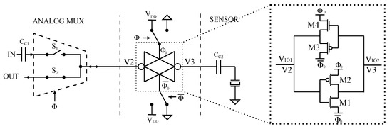 Figure 8 shows that the duration of the actuation should allow the propagation of the pulse from the input terminal to the sensor. This time interval is usually much shorter than the read-out mode, in which it is necessary to measure multiple periods of the output signal to increase the accuracy of the frequency measurement. The oscillation of the sensor () is initiated by the input pulse (IN), but the output signal (OUT) can be measured only when the system changes its state in read-out mode. In order not to create ambiguity, the input and the output terminal of the front-end are named IN and OUT, while the input and the output nodes of the bidirectional amplifier are labelled as V2 and V3. Finally, the design of this front-end consists of researching the best value for the coupling capacitors and the parameters of the control signals such as frequency () and duty cycle (D). The following sections will provide the modelling of the bidirectional front-end, which will allow for defining design rules for these parameters.