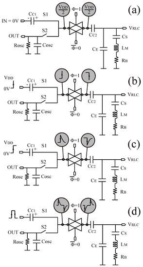 In order to provide a simple but useful model, a BvD load is used to mimic the behaviour of a resonating sensor. The coupling capacitor has the purpose to separate the DC from the AC signals. Therefore, its value is usually much greater than all the other capacitances in this part of the circuit and it can be considered as a short circuit for most of the AC signals. Figure 12b provides a simple model of the amplifier derived by observing the waveform in Figure 10d. As shown by the piece-wise linear model, the bidirectional amplifier generates two opposite rectangular pulses. The circuit in Figure 12b is linear, so it is possible to evaluate the dynamic of the system by using the superimpose principle. The signal generated by the bidirectional amplifier is divided into two components as shown in Equation (1):