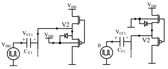Figure 11 highlights another secondary effect, which is the turning on of the source-bulk pn junctions inside the PMOS (P-TYPE MOSFET) and the NMOS (N-TYPE MOSFET) of the voltage buffer. Indeed, the simulation with the piecewise linear models in Figure 10d shows that the spikes at the assume values of and . These values do not belong to the power supply range and they turn on the pn juctions between the source and the body terminal of the MOSFET in the voltage buffer (M3,M4). This phenomenon could increase the power dissipation of the circuit or even worse, and it could start a destructive latch-up phenomenon in the transistors involved. Fortunately, it is possible to prevent the turning on of these pn junctions by using strong NMOS and PMOS in the the voltage buffer or smaller input coupling capacitor . This design strategy provides a faster reaction of the feedback when the system becomes imbalanced, so that does not have enough time to reach values outside the power supply range.