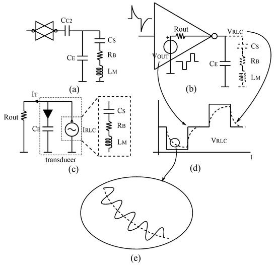 is composed of the same spectrum content of the signal except for the harmonic at the resonant frequency. The second component is made of the only harmonic of at the resonant frequency. The effects of can be evaluated considering the total impedance of the RLC elements to be . This is the reason why in Figure 12b the RLC has been drawn with dashed lines. Therefore, is characterized by a waveform that increases and decreases exponentially since it depends only on the response of a low pass filter made of and . The waveform obtained is represented in Figure 12d drawn with a dashed line. The effect of is to excite the RLC element, which generates an oscillation at the resonant frequency. The RLC elements now behave like an oscillator, which generates a damped sinusoidal signal, so it can be modelled as a current source generator as shown in Figure 12c. This current is divided into two parts, a small part is absorbed by the amplifier, creating a sinusoidal drop voltage on its output resistance, but the greater part will flow through the capacitance , because at the resonant frequency it usually shows a very low impedance. The second component of the voltage across the transducer can be calculated as: . Finally, the total voltage at this node is equal to , which means it is a combination of a small sinusoidal oscillation enveloped over an exponential signal as shown in Figure 12e.