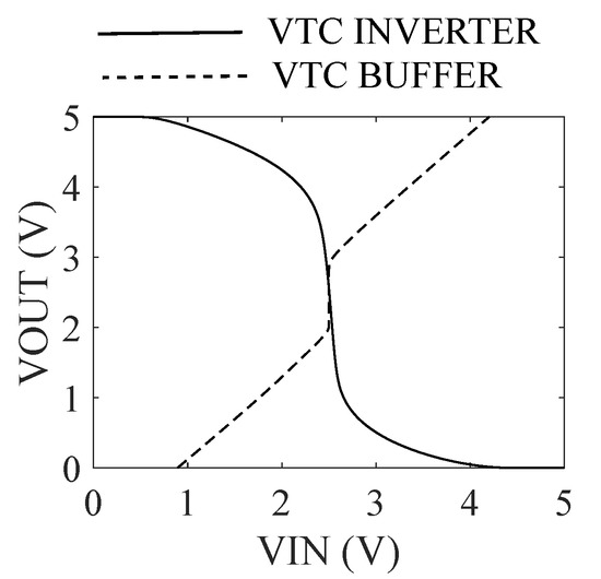 The bidirectionality of the PFGA is achieved by swapping the rails of the power supply. Indeed, the CMOS inverter and the CMOS voltage buffer in the PFGA present a sort of symmetry, which is highlighted in Figure 5.