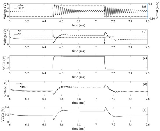 Simulation of the bidirectional amplifier in actuation mode using the LV (low voltage) model AMS-350nm model. (a) Input pulse and current through the RLC elements; (b) Input and output signals of the bidirectional amplifier; (c) Voltage across the input coupling capacitor; (d) Comparison between the output signal of the bidirectional amplifier and the signal across the transducer model; (e) Voltage signal across the coupling capacitor . = 50 mH, = 300 , = 300 pF, = 2 nF, = 1 nF, = 22 nF.