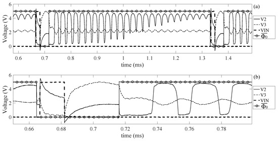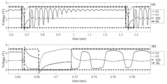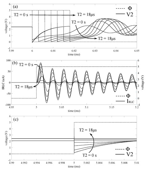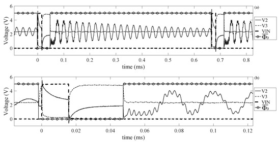 Figure 10d shows that the spikes at are squared and they are more similar to rectangular pulses. This is due to the fact that to perform this simulation are chosen very close to , thus narrowing the linear region of the inverter. Therefore, when or , the voltage at is still very close to one of the power supply rails and it reacts to the variations of only when assumes values in the linear region of the inverter VTC curve. The time necessary to bring the system back to the equilibrium state depends on the charge and discharge of the input coupling capacitor . Based on the polarity used for in Figure 9, these two times are called and because they correspond to the discharge and charge of this capacitor respectively. Therefore, by tuning , it is possible to set the time during which is fixed at one of the power supply rail. In particular, decreasing the value of , it is possible to reduce the time to charge and discharge this capacitor, which, in the limit, can be set to pull toward before it reaches one of the power supply rails. Since the amplitude of the signal is related to the excitation of the transducer, it can be concluded that, by tuning , it is possible to vary the magnitude of the energy provided to the transducer and therefore it is possible to control the amplitude of the sensor response during the read-out mode. Other two important parameters are and , which are the time intervals that define the relative position of the input pulse inside the actuation mode. The waveform of showed in Figure 10 suggests that the resonant sensor will be excited two times, once for each edge of the input pulse. This is an unwanted phenomenon, which will be analyzed more in detail in the next section performing a simulation.