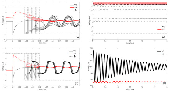A simulation has been performed by sweeping the time interval in the range [18 s, 40 s]. Figure 20a shows the waveforms of and a few instants after the transition from actuation mode to read-out mode, while Figure 20c shows the same waveforms after the oscillations are almost completely damped. The results in Figure 20a,c show dispersive waveforms with different steady state values depending on the value of . The main cause of this dependency is supposed to be due to the shape of after the transition. Indeed, approaches the steady state value exponentially and it requires different times. Furthermore, while decreases, the oscillation generated by the transducer overlaps the main signal affecting the shape of . The combined effect of these two causes provides different steady state values. The first contribution can be reduced by increasing the rate at which approaches to the steady state value. This can be achieved by increasing the size of M1, M2. Another simulation has been performed by increasing of ten times the size of M1, M2 ( = 10 m/350 nm, = 23 m/350 nm). The simulation results are shown in Figure 20b,d. As expected, the waveforms provide more regular behaviour, but, most important, they are characterized by the same steady state value. In conclusion, it has been proved that the transition from actuation mode to read-out mode is affected by the duration of the actuation mode. In particular, the position of the bias point is strictly related to the dynamic behaviour of . Finally, it has been proved that the stability of the bias point in read-out mode can be improved by using stronger MOSFET M1 and M2.