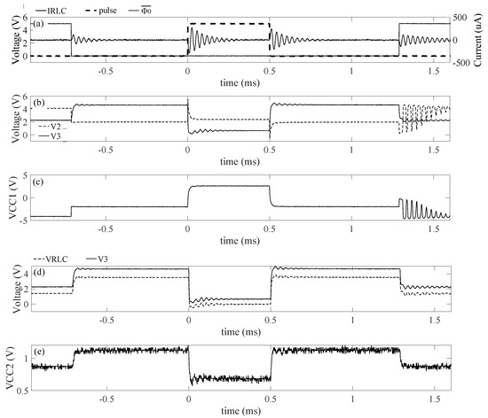 In this particular scenario, = 22 nF, = 2 nF, = 300 pF, which means that is characterized by an average voltage around 1/11 times the steady state value of , as proved by the signal shown in Figure 17e. Figure 17a shows a small oscillation at the very beginning of the actuation mode, which is induced by the transition from actuation to read-out mode as described in the previous section. Figure 17b shows that this transition produces a variation in , which is probably the cause of the unwanted oscillation. Finally, it can be noted that a small oscillation is overlapping the signal after the rising edge of the input pulse, which is due to the contribution of the RLC series elements to the dynamic of the circuit as described in Figure 12e.