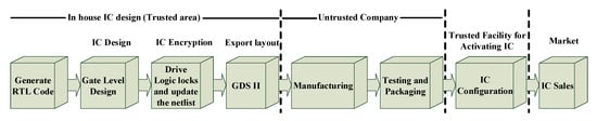 - Baumgarten, A.; Tyagi, A.; Zambreno, J. Preventing IC Piracy Using Reconfigurable Logic Barriers. IEEE Des. Test Comput. 2010, 27, 66–75. [Google Scholar] [CrossRef]