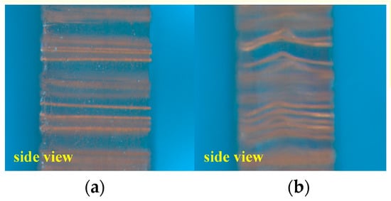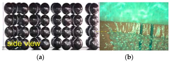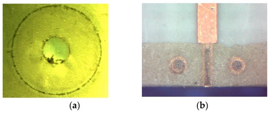 One cause of defect is illustrated in Figure 26. On the left, the side view of a virgin ACP with pins as conducting elements is shown, whereas on the right, the same specimen is depicted after a single contact cycle at increased contact force, which led to irreversible damage. In contrast, conducting polymers with spheres turned out to be much more durable under increased contact forces. However, in these materials, the filaments tend to agglomerate under increased contact forces after high cycle counts. This phenomenon is depicted on the left side of Figure 27. The outer black circle originates from agglomerated spheres after 105 contact cycles between the outer conductors of sexless coaxial connectors. The part of the inner conductor is even ruptured for the same reason. However, these agglomerations did not lead to any influence with regard to the electrical parameters. The right side of Figure 27, for example, shows the microstrip-to-microstrip assembly from Section 3 revealing spheres agglomerated after 300 contact cycles under a contact force 10 times higher than suggested by the vendor. Despite the obvious structural deterioration, the signal propagation parameters did not exhibit any deviation from those of the un-deteriorated conducting polymer. Generally, the measured insertion loss of this material turned out to be quite insensitive to different contact forces. To avoid such agglomerations, it is necessary to calculate the contact force from the recommended force per area figure, multiplying by the actual contact footprint area only instead of the entire ACP area. Another challenge consists in printed circuit boards that are largely uneven. Intending to ensure a reliable contact, PCBs are often pressed too hard onto the test fixture, causing deterioration discussed above. It is therefore important to define a limit for the unevenness of printed circuit boards.