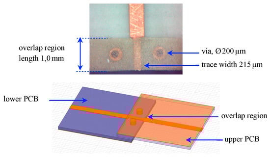 An obvious method for characterizing conductive polymer contacts is suggested by a typical application [6]: The ACP specimen is inserted between two identical PCBs carrying transmission lines with one end connected to measurement equipment and the other just open. To this end, one PCB is placed upside down onto the other, such that the open ends of the transmission lines are slightly overlapping. Measurements are taken first without an ACP specimen inserted and then with the specimen between the overlapping contact region (Figure 3).