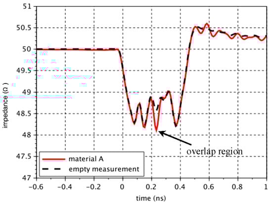 Compared to the black dashed line of the empty measurement in Figure 4, the insertion of an ACP specimen leads to a capacitive drop between 0.2 and 0.3 ns in the impedance profile. This is mainly caused by the geometry change in the overlap region of the measurement assembly due to the additional polymer thickness of 60 µm [6]. Microstrip lines can be utilized as well as coplanar waveguides in this methodology.