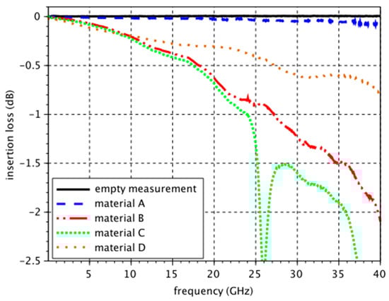 Using the same approach, 2.4 mm connectors were also modified in a similar way in order to determine the insertion loss of different ACP materials up to 40 GHz. Only with this type of connector was it possible to measure materials with lower filament density due to the larger area of the inner connector. As displayed in Figure 8, the ACP specimens reveal tremendous performance differences in terms of insertion loss. Moreover, there was a large number of ACPs, whose frequency range is considerably restricted. The related results are not shown here.