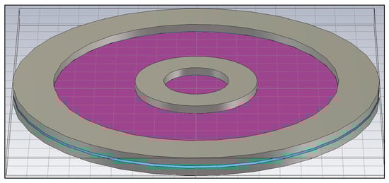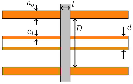 In order not to characterize the ACP just by the impedance profile or insertion loss of an individual sample, material parameters for use with 3D filed solvers were extracted. As ACPs are composite materials of dielectric matrix and conductive filaments, such figures are not actually physical but “apparent” parameters [7]. These apparent material parameters were obtained according to the methodology described in Section 3.2, using an assembly of two sexless APC7-type connectors where the elastomer is inserted in between. Figure 9 shows a longitudinal cross section through the assembly and its geometrical dimensions, where t describes the thickness of the material under test (MUT).