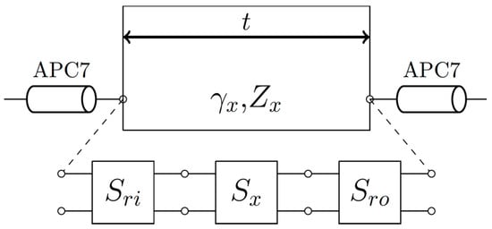 As per TOSM (through, between all ports, open, short, match at each port) calibration, the reference planes are thus set to the outer surfaces of the ACP specimen, and the assembly can be described by the S-Parameter cascade model in Figure 10.