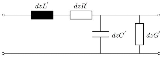 Since the volume of metal particles inside the examined material occupies only a small part of the total volume, the mentioned effects will have little impact on the extracted parameters compared to other uncertainties along the measurement. Following a perturbation approach, the fields will be assumed not to change dramatically due to the additional effects. Hence, the coaxial waveguide formed by the elastomer may also be described by the transmission line model, where a section of infinitesimally small length dz is modeled by the equivalent circuit network shown in Figure 11.