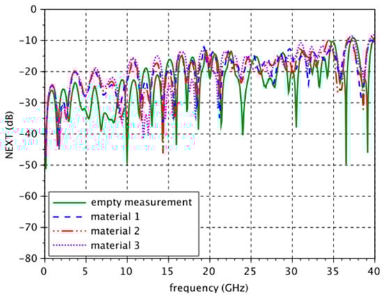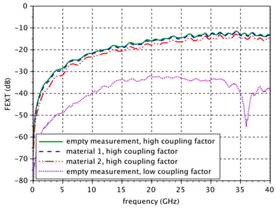 Figure 18 and Figure 19 show FEXT and NEXT, respectively, measured on strongly coupled transmission lines without an ACP specimen (solid green) and with two different ACP specimens (dashed blue and dash-dotted red, respectively) in comparison to weakly coupled lines without an ACP specimen (dotted violet).