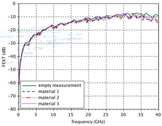 FEXT measured with the planar transmission line contact assembly of Figure 19 without an ACP specimen inserted and with three different ACP specimens.