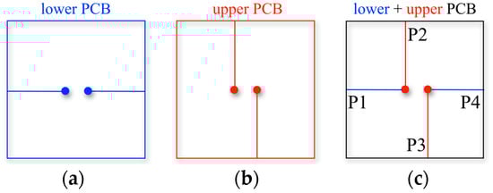 Concept of planar BGA contact pad assembly from Figure 23. (a) lower PCB (b) upper PCB (c) lower+upper PCB