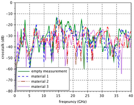 The red continuous line of Figure 25 represents the empty measurement. Based on a comparison to that, the insertion of all types of investigated anisotropic conducting polymer does not result in any additional appreciable crosstalk. Contrary to the initial, intuitive assumption mentioned at the beginning of this section, the investigated materials do not increase crosstalk effects between lines or BGA pads. Therefore, the application of thin anisotropic conducting polymers as temporary microwave interconnects in test fixtures is not limited because of additional crosstalk. This observation is also in accordance with the relatively high apparent loss tangent of the ACP inferred by the considerations in Section 4, which causes sufficient attenuation in the transversal direction.