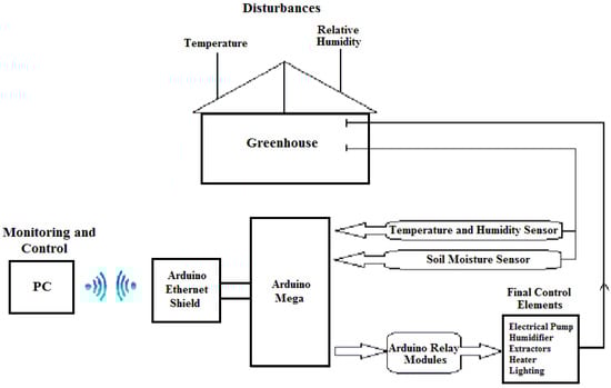 Recently, the use of open source hardware for remote control systems for low-cost greenhouses [,] and for the monitoring of environmental parameters in precision agriculture [] has become popular. Furthermore, wireless sensor networks are now used for irrigation control and monitoring in different sectors of agriculture [,]. Strategies that have been used include wireless sensor networks for precision agriculture [], the control of a greenhouse ventilation system with a field gate programmable array [], a hybrid controller predictive of nocturnal greenhouse temperatures [], the optimal control of climatic conditions in a greenhouse using minimal energy and grower defined bounds [], and an irrigation remote monitoring system based on ZigBee [].