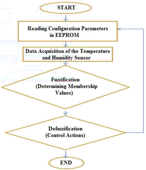 Figure 5 shows the flowchart of the fuzzification and defuzzification processes for temperature and relative humidity. For the irrigation and lighting stages a similar process was used.