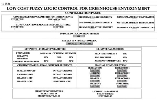 It was possible to obtain the wireless connectivity needed to allow any device with Wi-Fi available within the local area network established to easily and accurately monitor and control the system, additionally providing the option to manually activate the final control elements in real time, as proposed in []. The effectiveness of fuzzy logic, with which it was possible to define all situations that may occur in the greenhouse, was demonstrated. The results mentioned above are further supported in work carried out in [], in which the temperature and illuminance of a greenhouse were controlled. On the other hand, the results obtained in [] highlight the improvements that can be achieved in terms of greenhouse temperature control when a fuzzy controller is used with particle swarm optimization. Finally, it should be emphasized that the application developed in this work, allowed for man–machine interaction, offering access to the configuration, monitoring, and control of a fuzzy system, as proposed in [,,,].