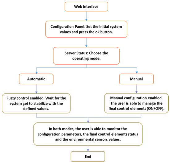 Subsequently, the interface allows the definition of server status in automatic or manual modes. In automatic mode, the control system makes decisions based on previously set parameters, disabling manual control. In the set point climate settings, the values set in the configuration panel for relative humidity and temperature are displayed. In the climatic settings box, relative humidity, soil moisture, and temperature measurements, which are obtained in real time from sensors installed in the greenhouse, are displayed. In the current status box, the final control elements are displayed in real time. Finally, in manual mode, the web interface enables the user to activate lighting, irrigation, extractors, humidifiers, and heaters. Figure 8 shows the flowchart that summarizes the process followed when using the web interface.