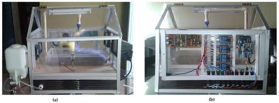 To test the system, a greenhouse using aluminum and acrylic was built. The greenhouse was 50 cm long, 40 cm wide, and 30 cm high with respect to the upper corner of the structure, in which the sensors, the control system, and the final control elements were installed (Figure 9).