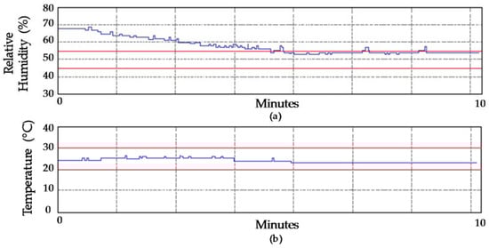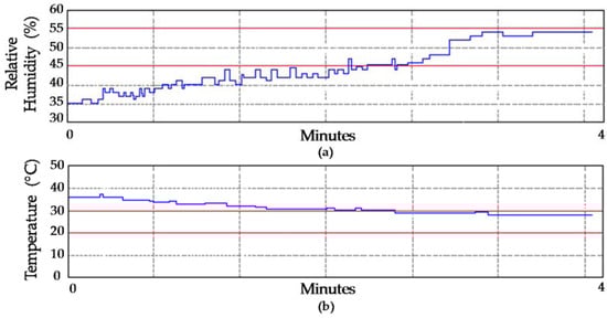 Results obtained when the relative humidity is above the set point and the temperature is in the defined range. (a) Relative humidity; (b) Temperature.