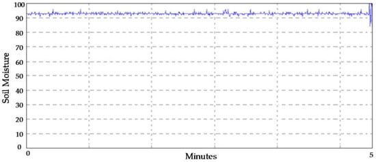 Finally, to test the irrigation system, the activation of this mechanism was carried out for a total time of 105 s, which was previously set through the web interface. A total of 9 irrigations were made, with a duration of 5 s and a waiting time of 5 min between each irrigation. During the first 5 min of waiting, after applying the first irrigation, the results showed a large variation in moisture sensor readings, from 30% to 100%, which was due to the effect of water distribution in the soil, which covered the sensor and the lack of homogeneity. However, for the ninth irrigation, an average moisture stabilized at 93% was obtained, so the proper functioning of the system was verified (Figure 12).