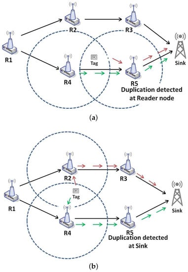 Intra-path redundant data: is the situation when the tag that generates redundancy is located between two readers in the same path as shown in Figure 2a. It can be easily detected, and the data can be filtered in the next hop.