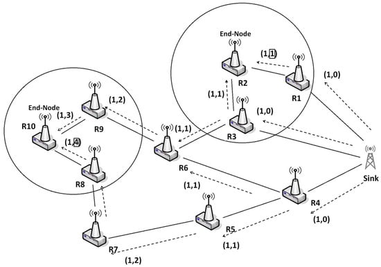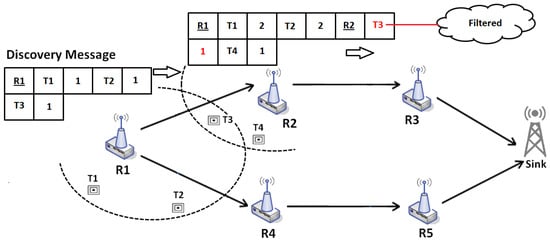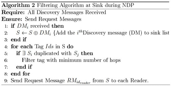 To summarize the mechanism of NDP, Figure 9 represents the main steps involved in this phase. (i) R1 sends a discovery message to the sink through all routes. All readers filter and aggregate data once the discovery message is received; (ii) The sink receives all discovery messages and decides what tag have to be sent by each reader, to which it sends a request message.