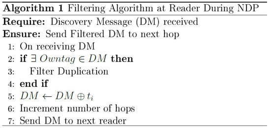 Once a node receives a Discovery Message (DM) from it neighbor, it first checks if there is an intra-path data duplication by comparing the tag on the received DM with tag from . If similarity is detected, the reader filters the duplicated data, adds its list of tag to the discovery message, and sends it to the next reader. The steps involved in this algorithm are further illustrated in the pseudo-code at Figure 5.