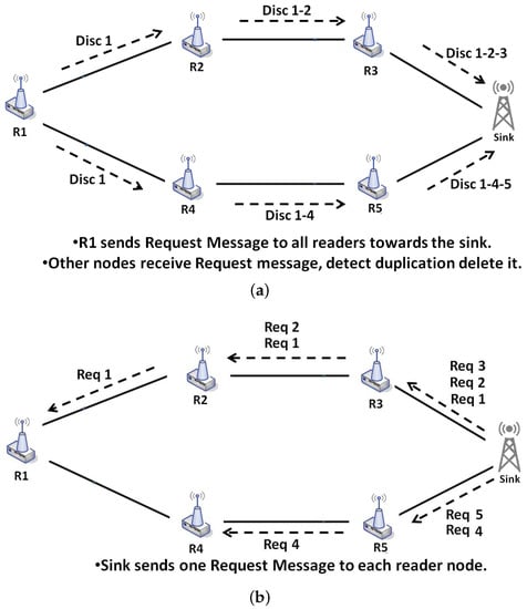 Example of Network Discovery Phase: (a) discovery messages; (b) request messages.