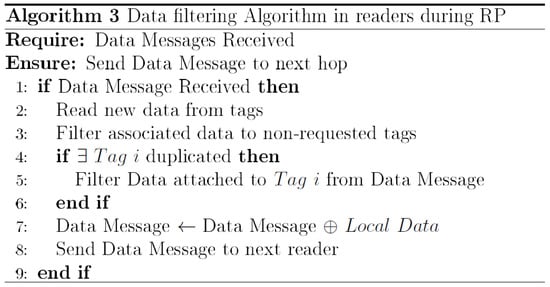 After the Network Discovery phase is completed, the network starts running. During this phase, called the Reading Phase (RP), readers collect data from sensor-tags and send it through the network. The readers also perform the task of routing data and filtering duplication. When a reader node receives data from another reader, it checks if intra-path data redundancy will be generated. To do that, it activates the reading mechanism to recover new data from the tags. Since all tags are passive during the reading, the reader will receive data from all tags located in its reading range. However, it has to locally delete the extra-path redundant data, and only keep in it the data table data coming from tags requested by the sink in the Request Message. Once done, the reader checks the tag in the received data and compares it with based on the last reading. If duplication is detected, the node removes the data attached to the tag from the message and send it toward the sink. To summarize, the mechanism of filtering during reading phase includes three main steps: