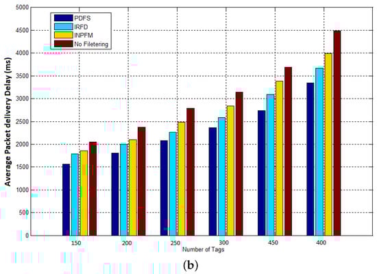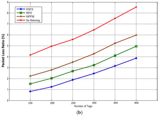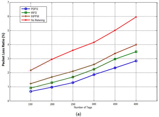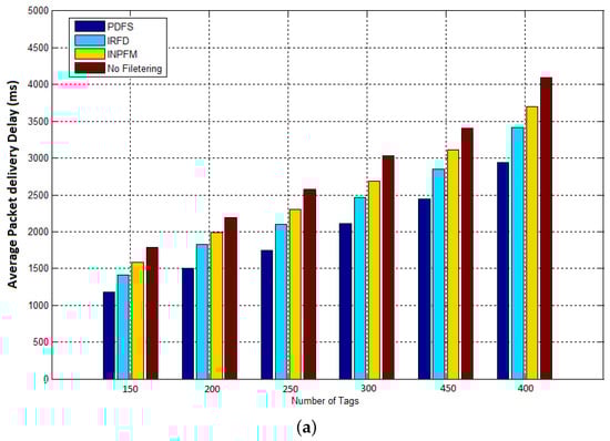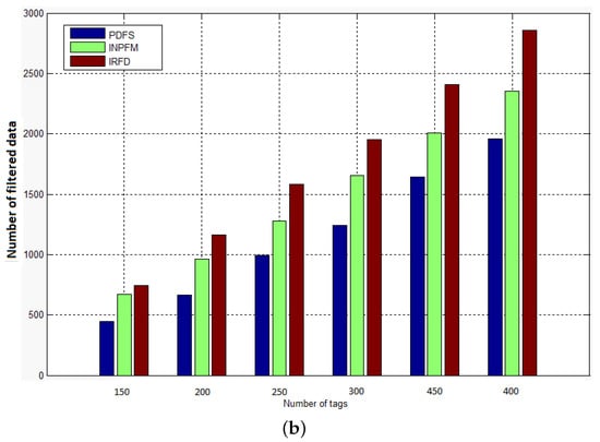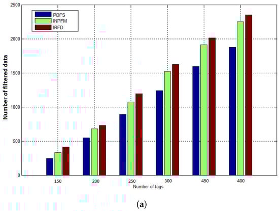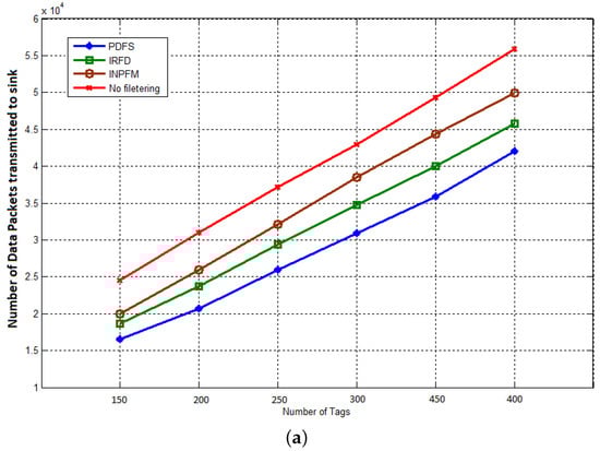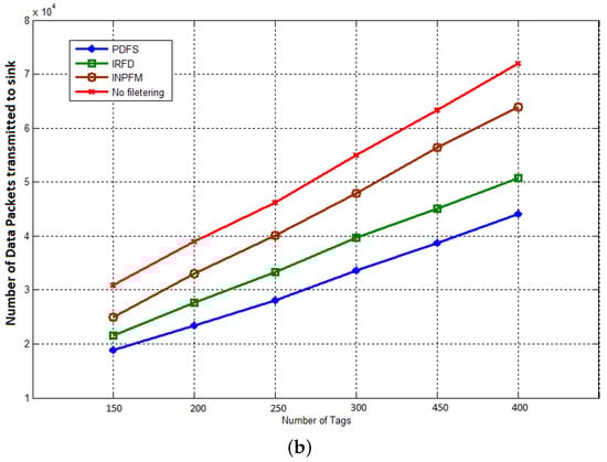 Our first result concerns the number of transmitted packets during both phases of network’s lifetime. In Figure 11a,b, we compared the results of this metric for our proposed scheme with INPFM and IRFD methods. We also present results when the network runs without any filtering scheme. The Sub-Figure 11a shows the number of transmitted packets to the sink versus the number of tags when the duplication ratio is around 40%. We can see how the climbing cadence of generated data sent in the network decreases when our proposed filtering scheme is used. The Sub-Figure 11b also shows the number transmitted packets to the sink versus the number of tags when the duplication ratio is low and around 10%. We can deduce from these figures that when the duplication ratio increases, the performances of our scheme becomes more obvious.
