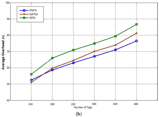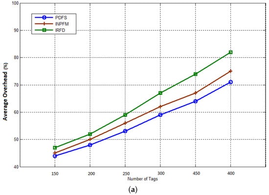The final result concerns the network overhead. We consider this metric as a ratio between the total number of generated packets and the number of received data packets at the sink. Figure 15a,b show the average network overhead during reading phase for duplication rates 10% and 40%. During this phase, all nodes (readers) send collected data from tags to the sink. We can see how our filtering scheme significantly reduces the network overhead compared with the other methods. We can also notice that, contrary to the previous results, INPFM outperforms IRFD in terms of overhead due to the great number of control packets transmitted in IRFD, especially to detect inter-cluster duplication.