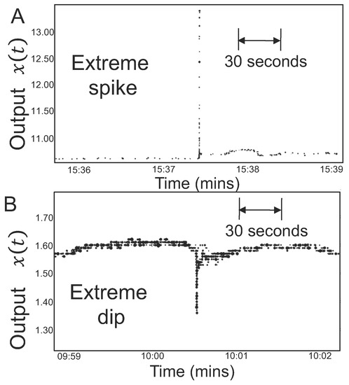 The recent technological advances in the speed and processing power of electronic components, are fueling a drive towards increased automation and global reach of society’s cyberphysical systems [1,2]. Since these systems operate in a free market economy in most countries, and each component almost by definition is looking to win, this means that such systems can be regarded as a heterogeneous collection of competitive components that operate as an ecology driven by survival of the fittest [1,2,3,4,5,6,7,8,9]. This leaves regulators with the significant problem of understanding what might go wrong at the system level, and how to prevent it. An ideal example of such a system is the decentralized network of electronic financial exchanges that has grown up across the globe. The resulting system comprises a heterogeneous, decentralized collection of adaptive, autonomous components (e.g., trading platforms and hard-wired logic gates) where each has limited information about the overall system and limited processing power [10,11,12,13]. Such financial market systems operate down to the microsecond timescale beyond human reaction times, and hence may serve as a proxy for any other all-electronic, decentralized system comprising an ecology of hardware and software components, network links, and underlying algorithms which compete to make a profit [10,11,12,13]. Figure 1 shows two examples of the type of subsecond tsunami (i.e., extreme behaviors) that have been observed in the real all-electronic exchange data (see Ref. [14] for more details). Both are more than 30 standard deviations larger than the average price movement either side of an event and so are very unlikely to have arisen by chance. During the period of study of approximately five years, we found 18,520 such ultrafast dips and spikes. Figure 2 shows a plot of their sizes and durations. There is therefore an urgent need to deepen our understanding of the stability of such decentralized electronic systems. In particular, the stability and safety of such systems will rely on understanding what extreme behaviors can occur, why, and what might be the impact of both intentional and unintentional system perturbations.