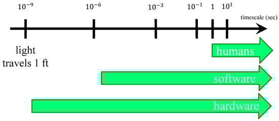 Schematic shows the typical timescales for human action (i.e., intervention), electronic hardware operations, and for running software including trading algorithms. The limits of electronic hardware coincide with the lower limit set by the phonon scattering time. Switching processes in typical electronic circuits determine the operating time of software algorithms. As a result, the relevant regulatory bodies face a daunting task of how to ensure system safety and (in a market setting) fairness to all participants in terms of when they receive relevant information. Moreover, regulatory bodies need to provide this reassurance without relying on any real-time human intervention during moments of potential subsecond-scale instability.