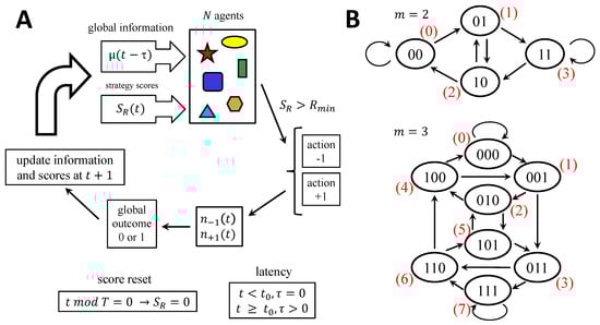 The system dynamics are conveniently shown as transitions on a de Bruijn graph [29]. Figure 4B gives some examples for (upper panel) which has possible nodes, and (lower panel) which has possible nodes. The arrows on the de Bruijn graph show the allowed transitions of the system from one timestep to the next. In the case here that each agent has more than one strategy (i.e., ), the strategy with the highest score is selected. When a tie arises for a given pair of strategies, then the agent flips a coin as to which one to use—which adds a source of stochasticity into the game dynamics. In the GCMG and DGCMG (but not the MG), an agent is only active at a given timestep if their highest-scoring strategy is above some minimum threshold value which is set at the beginning of the game. This threshold feature helps generate fluctuations in the number of participating agents at any given timestep, which is an essential feature for a realistic market-like model [14,23,24]. The distinguishing feature of the DGCMG as compared to the GCMG, is that at a timestep , the global information available to the agents starts being delayed by timesteps—hence it is the true global information from timestep instead of from t. This mimics either an intentional or unintentional feedback delay.