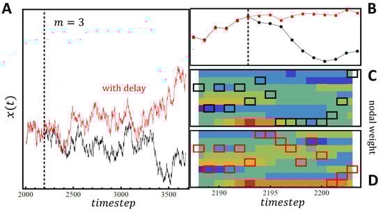 (A) System output (e.g., price) for the GCMG (black line—no delay) and the DGCMG (red line—delay introduced at timestep ). The population of components (i.e., agents) has size : each inputs the system-wide reported information (see Figure 2) and can output an action; (B) Panel A magnified around , the time of the delay implementation; (C) Dynamics of GCMG shown in terms of the nodal weights (see main text); (D) Corresponding dynamics of DGCMG. In (C,D), there are nodal weights at each timestep, shown on the y-axis, corresponding to the possible nodes in the de Bruijn graph. The highest weight is red while lowest is purple.