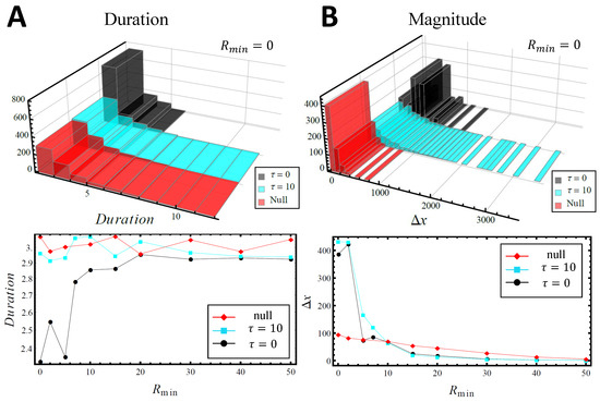 Figure 6 turns to look at the impact of the delay on the duration and magnitude (i.e., severity) of the extreme events generated by the the delay . Specifically, Figure 6 looks into single-node extreme events for three cases: GCMG, DGCMG and null-GCMG. The null-GCMG consists of an analogous set-up to the GCMG: however instead of using s strategies, agents use s coins to decide the action. Since the agents use coins, there is no pre-determined action for a particular piece of global information (i.e., a particular bit-string history length m). Instead, the coin-flip determines an equal probability for each option and . As in the GCMG, each strategy receives a score after each timestep according to its performance. Figure 6A shows our results for a single-node crash duration while Figure 6B shows the corresponding results for the magnitude. Both upper panels depict the distribution for these three models when the threshold for participation is zero over a period of timesteps (i.e., , noting that in principle can in general be set to be negative or positive). We find that although the delay tends to increase the duration of such extreme events, it is not notably different from the null version. However the magnitude shows that the DGCMG and the null-GCMG are indeed highly contrasting models showing a much larger magnitude for the DGCMG that compares, on average, to that of the GCMG. This can be explained with the fact that the null-GCMG is uncorrelated and hence the excess demand on average tends to zero. On the other hand the GCMG and DGCMG experience the crowding effect (see Section 5.1) and hence the resultant correlated excess demand contributes to a much greater extreme event magnitude. The lower panels show that as the confidence threshold for participation increases, the outcomes for the three models tend toward the same behavior for both duration and magnitude.
