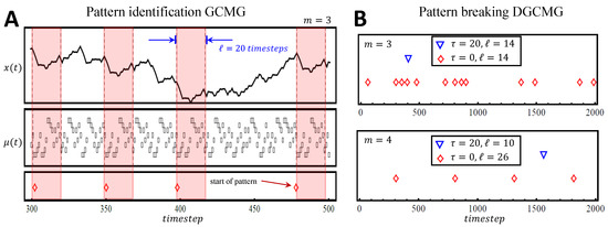 (A) Dynamical patterns in the GCMG for the case of . Top panel shows the price (), middle panel shows the global information () and the bottom panel uses diamonds to signal the start of a dynamical pattern. The 20 timestep length patterns are highlighted by the red shaded region; (B) Pattern breaking effect of latency for (top) and (bottom). Symbols represent pattern appearances of a given length ℓ, for a delay .