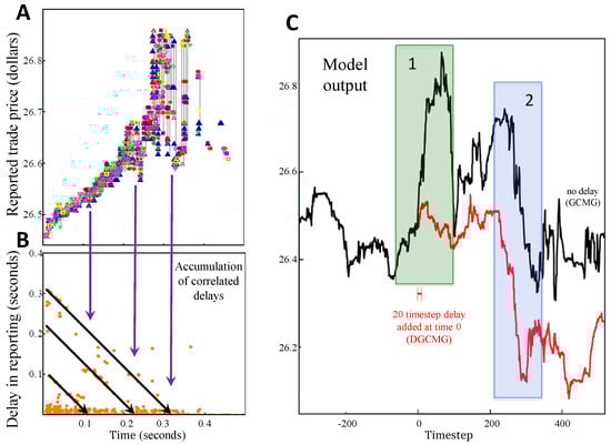 (A) The network of networks of U.S. electronic exchanges produces multiple examples of sub-second extreme behavior. In this example, the data-points show trades (i.e., prices of trade events) for Suncor stock within a 500 millisecond (i.e., s) time interval. Each color corresponds to a different electronic exchange network within the larger network of U.S. exchange networks. They are physically interconnected by communications channels. Data was kindly provided by NANEX; (B) Orange dots show the delay (vertical axis) between the time at which a particular trade event was reported system-wide and the time at which it actually occurred in a particular network exchange (which is shown on the horizontal axis). These delays predate the intentional 350 microsecond delay added in 2016 [13], however the fact that they show such strong temporal correlations demonstrates the possible effect of such an intentional (and hence highly temporally correlated) delay. The parallel diagonal lines show the shockwaves of successive trades eventually getting reported system-wide. The fact that these waves of system-wide reporting occur a few milliseconds ahead of significant dynamical features in panel A, is likely due to each reporting shockwave driving the networks’ trading algorithms (i.e., agents) to produce a sudden change in aggregate supply and demand, which the appears a few milliseconds later as a new dynamical feature in panel A; (C) DGCMG system output (red line) showing the price over time following a small delay introduced at . Black line shows same system but with no delay, i.e., GCMG. Window 2 shows a future extreme behavior akin to panel A that still occurs with the delay, while window 1 shows a future extreme behavior that effectively disappears when the delay is added.